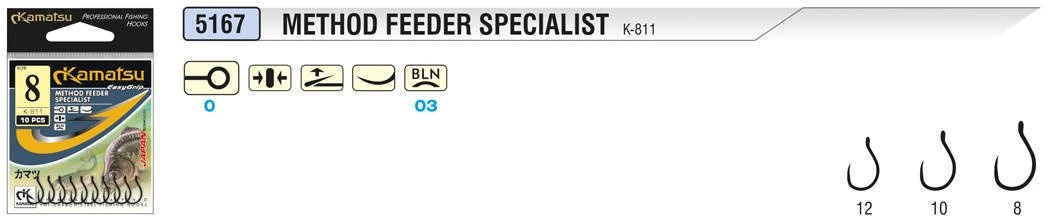 Specjalistyczny, bezzadziorowy haczyk doskonale spisujący się przy łowieniu z koszyczkami method feeder. Oczko odgięte ku tyłowi pozwala wiązać chwytne i niewidoczne przypony żyłkowe lub z fluorocarbonem.