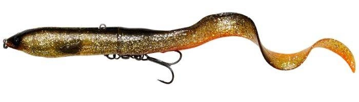 Super uniwersalna imitacja węgorza, pełna innowacyjnych funkcji. Ta konstrukcja jest prosta, ale przemyślana i zapewni doskonałą skuteczność w łowieniu każdego drapieżnika, który naturalnie atakuje węgorza lub minoga. Wystarczy, że będziesz łowił nim zwijając jednostajnie po wyrzucie z drobnymi podciągnięciami i przerwami, a efekt Cię zaskoczy. Długi ogon mocowany jest za pomocą wkrętu i sprawia, że przynęta kołysze się kusząco z boku na bok pozostawiając za sobą wspaniały ślad przypominający węgorza. Gdy ogon jest przykręcony z końcem skierowanym do dołu, wytwarzany przez obracający się ogon ciąg spycha przód przynęty w dół, dzięki czemu będzie ona płynąć tuż pod lustrem wody na mniej więcej tej samej głębokości. Po obróceniu ogona z jego końcem skierowanym do góry, a ciąg wytwarzany przezeń będzie unosił przód przynęty do góry tuż nad lustro wody tworząc bardzo widoczny ślad na wodzie. Łącząc te dwie niesamowite akcje ze szczegółowymi detalami odwzorowania opracowanymi na podstawie trójwymiarowego skanowania prawdziwego węgorza otrzymaliśmy przynętę, która oszuka nawet najbardziej ostrożne drapieżniki.