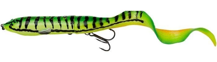 Super uniwersalna imitacja węgorza, pełna innowacyjnych funkcji. Ta konstrukcja jest prosta, ale przemyślana i zapewni doskonałą skuteczność w łowieniu każdego drapieżnika, który naturalnie atakuje węgorza lub minoga. Wystarczy, że będziesz łowił nim zwijając jednostajnie po wyrzucie z drobnymi podciągnięciami i przerwami, a efekt Cię zaskoczy. Długi ogon mocowany jest za pomocą wkrętu i sprawia, że przynęta kołysze się kusząco z boku na bok pozostawiając za sobą wspaniały ślad przypominający węgorza. Gdy ogon jest przykręcony z końcem skierowanym do dołu, wytwarzany przez obracający się ogon ciąg spycha przód przynęty w dół, dzięki czemu będzie ona płynąć tuż pod lustrem wody na mniej więcej tej samej głębokości. Po obróceniu ogona z jego końcem skierowanym do góry, a ciąg wytwarzany przezeń będzie unosił przód przynęty do góry tuż nad lustro wody tworząc bardzo widoczny ślad na wodzie. Łącząc te dwie niesamowite akcje ze szczegółowymi detalami odwzorowania opracowanymi na podstawie trójwymiarowego skanowania prawdziwego węgorza otrzymaliśmy przynętę, która oszuka nawet najbardziej ostrożne drapieżniki.
