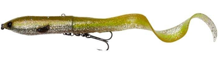 Super uniwersalna imitacja węgorza, pełna innowacyjnych funkcji. Ta konstrukcja jest prosta, ale przemyślana i zapewni doskonałą skuteczność w łowieniu każdego drapieżnika, który naturalnie atakuje węgorza lub minoga. Wystarczy, że będziesz łowił nim zwijając jednostajnie po wyrzucie z drobnymi podciągnięciami i przerwami, a efekt Cię zaskoczy. Długi ogon mocowany jest za pomocą wkrętu i sprawia, że przynęta kołysze się kusząco z boku na bok pozostawiając za sobą wspaniały ślad przypominający węgorza. Gdy ogon jest przykręcony z końcem skierowanym do dołu, wytwarzany przez obracający się ogon ciąg spycha przód przynęty w dół, dzięki czemu będzie ona płynąć tuż pod lustrem wody na mniej więcej tej samej głębokości. Po obróceniu ogona z jego końcem skierowanym do góry, a ciąg wytwarzany przezeń będzie unosił przód przynęty do góry tuż nad lustro wody tworząc bardzo widoczny ślad na wodzie. Łącząc te dwie niesamowite akcje ze szczegółowymi detalami odwzorowania opracowanymi na podstawie trójwymiarowego skanowania prawdziwego węgorza otrzymaliśmy przynętę, która oszuka nawet najbardziej ostrożne drapieżniki.
