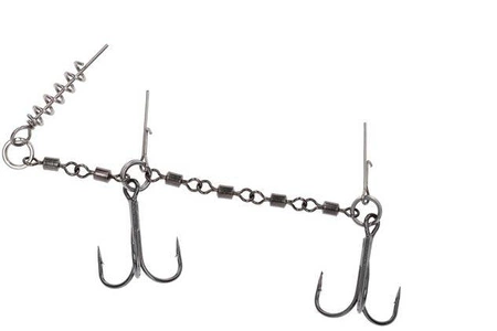 Podwójna dozbrojka z wkrętem i pinami. Zastosowanie kilku krętlików pozwoliło uzyskać bardzo mocne połączenie, które eliminuje możliwość wytworzenia zjawiska dźwigni podczas holu, dodatkowo stabilizując gumę. Rozmiar XL dedykowany do największych przynęt.