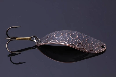 Niespotykany rzadki kształt! Potocznie nazywana żabką, zresztą nie bez przyczyny. Swoimi ruchami przypomina odrętwiałą, budzącą się do życia żabę, która jest typowo wiosennym pokarmem dla niektórych łososiowatych ryb. Jej pracę można określić jako leniwą, nie ma bowiem tendencji do wpadania w ruch wirowy, tylko wykonuje silne wahnięcia i „myszkuje”. Właśnie dlatego, doskonale spisuje się na szybko płynących rzekach z silnym nurtem. Polecamy ją do obławiania rynien pod brzegiem. Można to robić tradycyjnym wachlarzem, lub przeciągnąć błystkę bezpośrednio pod prąd z przytrzymaniem jej na parę sekund w bardziej obiecującym miejscu.