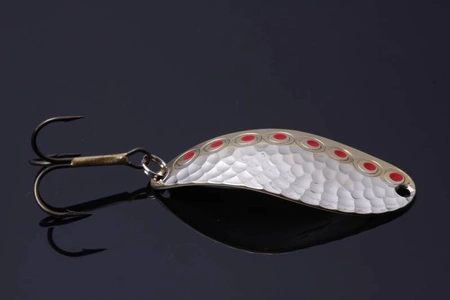 Niespotykany rzadki kształt! Potocznie nazywana żabką, zresztą nie bez przyczyny. Swoimi ruchami przypomina odrętwiałą, budzącą się do życia żabę, która jest typowo wiosennym pokarmem dla niektórych łososiowatych ryb. Jej pracę można określić jako leniwą, nie ma bowiem tendencji do wpadania w ruch wirowy, tylko wykonuje silne wahnięcia i „myszkuje”. Właśnie dlatego, doskonale spisuje się na szybko płynących rzekach z silnym nurtem. Polecamy ją do obławiania rynien pod brzegiem. Można to robić tradycyjnym wachlarzem, lub przeciągnąć błystkę bezpośrednio pod prąd z przytrzymaniem jej na parę sekund w bardziej obiecującym miejscu.