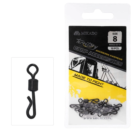 Popularny w wędkarskie karpiowym krętlik z szybkozłączką w standardowym rozmiarze 8, pasującym do bezpiecznych klipsów. Niezbędny przy produkcji wszelkich przyponów i zestawów końcowych podczas połowu karpi czy amurów. Wykończony czarnym, matowym kolorem.