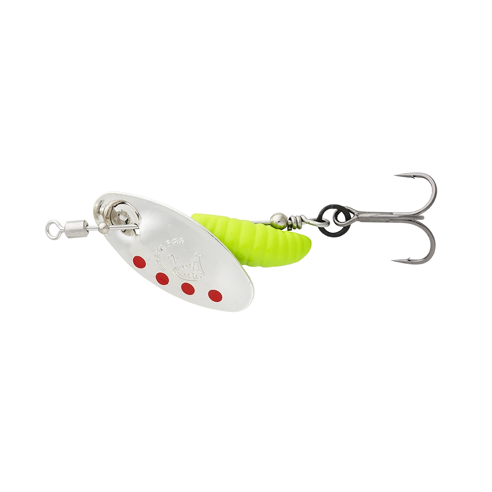 Korpus w kształcie larwy w połączeniu z unikalną akcją oznacza, że ta błystka obrotowa z pewnością skusi drapieżniki do ataku. Obracające się, migające skrzydełko, które przyciąga uwagę ryb, łączy się z subtelnym i atrakcyjnie wyglądającym korpusem. Wbudowany krętlik pomaga uniknąć skręcania się linki, a ilość skutecznych zacięć zwiększa się dzięki obecności bardzo ostrych kotwic oraz równie ostrych, pojedynczych haków.