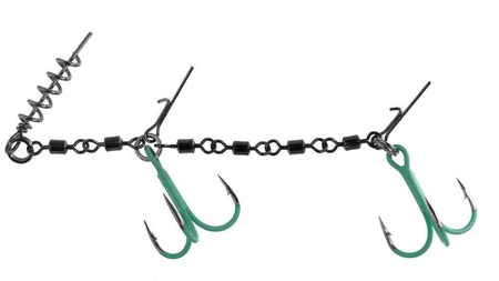 Podwójna dozbrojka z wkrętem i pinami. Kotwice zostały pokryte farbą fluo co zwiększa skuteczność zacięć podczas ataku ryby.