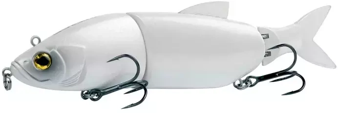 - Twardy, 3-częściowy swimbait z miękkim ogonem i płetwą grzbietową