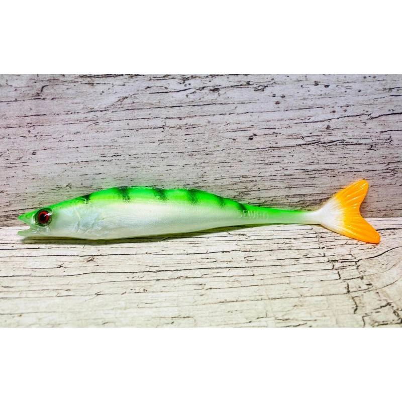 Prezentowana przynęta to imitacja do złudzenia przypominająca żywą rybę swoim wyglądem oraz bardzo wabiącym ruchem w wodzie. Bardzo ceniona przez wędkarzy za jej skuteczność. Wykonana z wysokiej jakości plastisolu. Produkt wykonany ręcznie zatem poszczególne partie mogą różnić się nieco odcieniem.