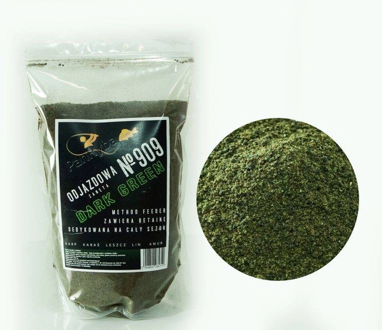 - 909 ODJAZDOWA DARK GREEN to zanęta method feeder składająca się z wysokobiałkowych mączek rybnych, green betainy oraz green algae.