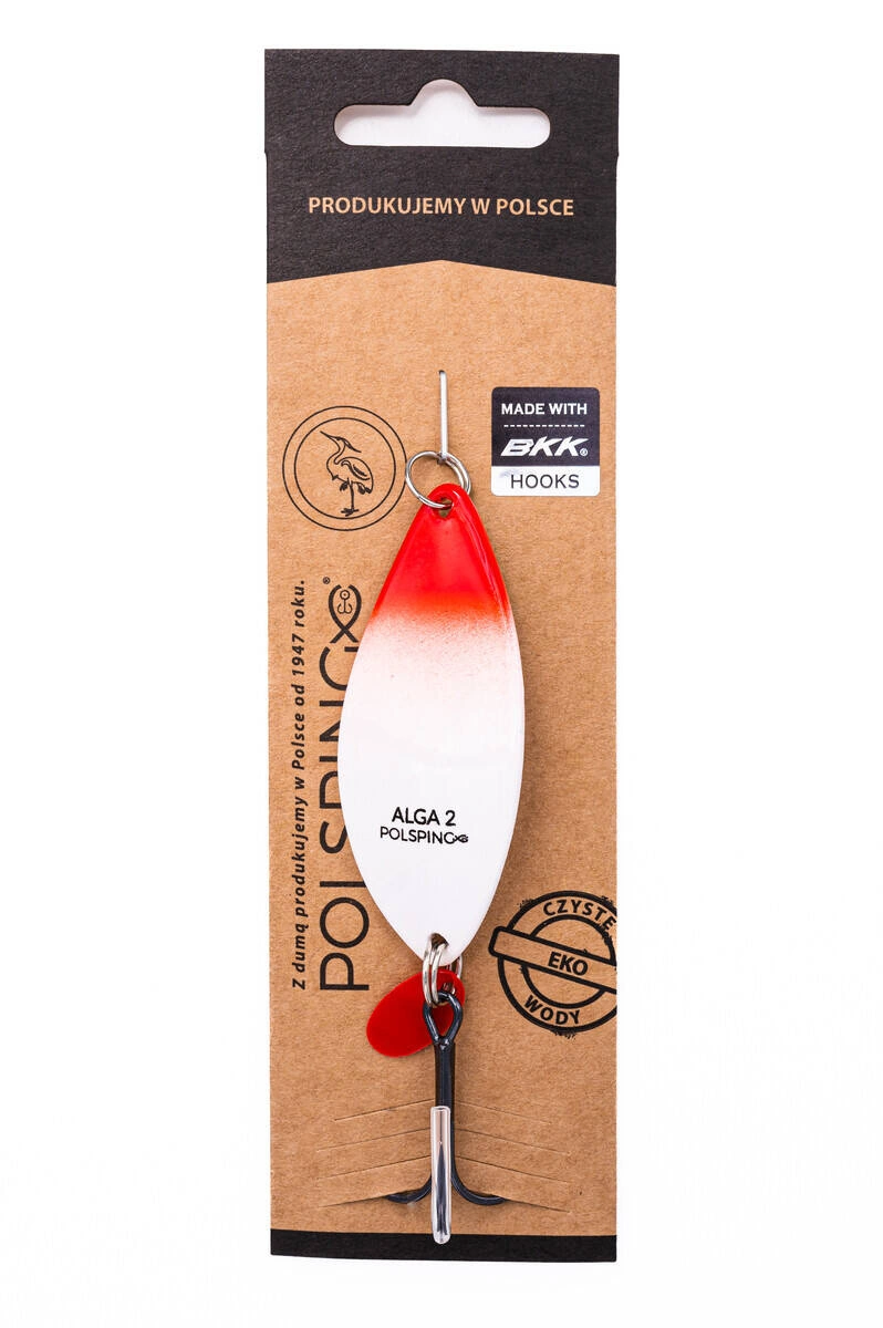 Blachy o nazwie Alga nikomu przedstawiać nie trzeba. Już nasi dziadkowie łowili na nią okazałe szczupaki. Zamaszysta praca i dodatkowy wabik na kotwicy w postaci czerwonej płetwy są super skuteczne na szczupaki i sumy. W mniejszych rozmiarach Alga łowi również okonie, pstrągi, trocie czy bolenie. Jednym słowem jest to legendarna, uniwersalna przynęta! Została uzbrojona w najwyższej klasy kotwicę BKK oraz mocne, nierdzewne kółka łącznikowe.