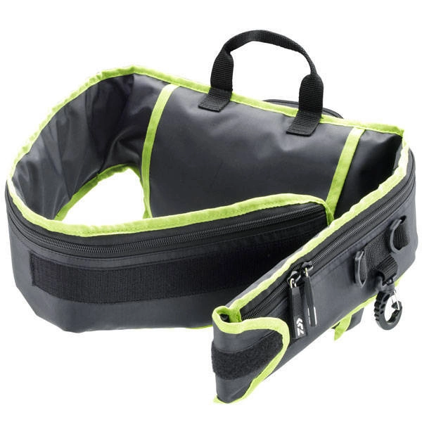Wędrowna torba na pas i futerał w jednym. Pomysłowe rozwiązanie, idealne na długie spinningowe wyprawy, w trakcie których nie potrzebujemy zbyt wiele sprzętu. Obie zewnętrzne kieszenie o wymiarach 20x16cm bez problemu pomieszczą pudełka o gabarytach 19.5x15.5cm. Dodatkowa przednia kieszeń o wielkości 12x16cm nadaje się do przechowywania dokumentów, kluczy itp. Dodatkowo z przodu za pomocą karabińczyka podczepić można uchwyt na szczypce oraz uchwyt na butelkę bądź puszkę. Na boku torba posiada dwa duże karabińczyki, do których dopiąć można kolejne elementy wyposażenia. Torba mocowana jest na pasie przy pomocy rzepów i jest bardzo wygodnym rozwiązaniem.