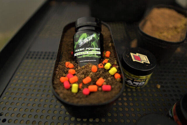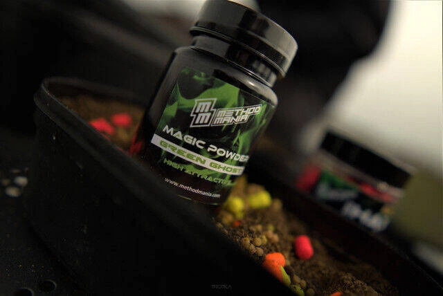 METHOD MANIA MAGIC POWDER – mocno skondensowany i intensywnie barwiący atraktor w formie sproszkowanej. Jego głównym zadaniem jest prowokacja ryb na zbiornikach mocno przełowionych, o zamulonym lub mocno zarośniętym dnie. Dobrze sprawdza się na wodach mało klarownych lub zanieczyszczonych. Może być stosowany jako dodatek do zanęt i pelletów. Jest również wykorzystywany jako posypka do przynęt. Dzięki walorom smużącym pozwala zwiększyć atrakcyjność mieszanki/ przynęty. Delikatny rybny zapach intensyfikuje się po kontakcie z wodą. Zastosowanie ciemnego opakowania zapobiega dostawaniu się promieni UV, co przedłuża świeżość i atrakcyjność produktu.