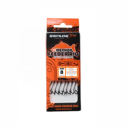 Method Feeder RIG to przypony dedykowane do łowienia podajnikiem method feeder. W przyponach zastosowano niezawodne haki BKK oraz najwyższej jakości linki co gwarantuje pewne zacięcie i bezpieczny hol największych ryb. Doskonale sprawdzą się na dzikich oraz komercyjnych łowiskach. Przypony sygnowane Team Genlog. Dostępne w 2 długościach i 6 rozmiarach haka, pakowane po 8 szt.