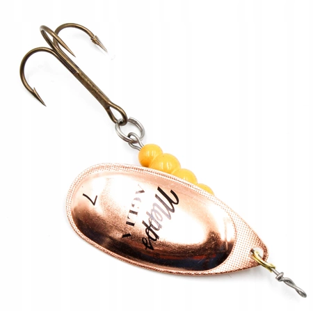 Aglia no7 - to błystka pozwalająca łowić sportowo bardzo duże ryby, przede wszystkim okazowe szczupaki oraz sumy. Przeznaczona jest na spokojne odcinki rzeczne oraz na zastoiska, w których bytują duże szczupaki i sumy.
