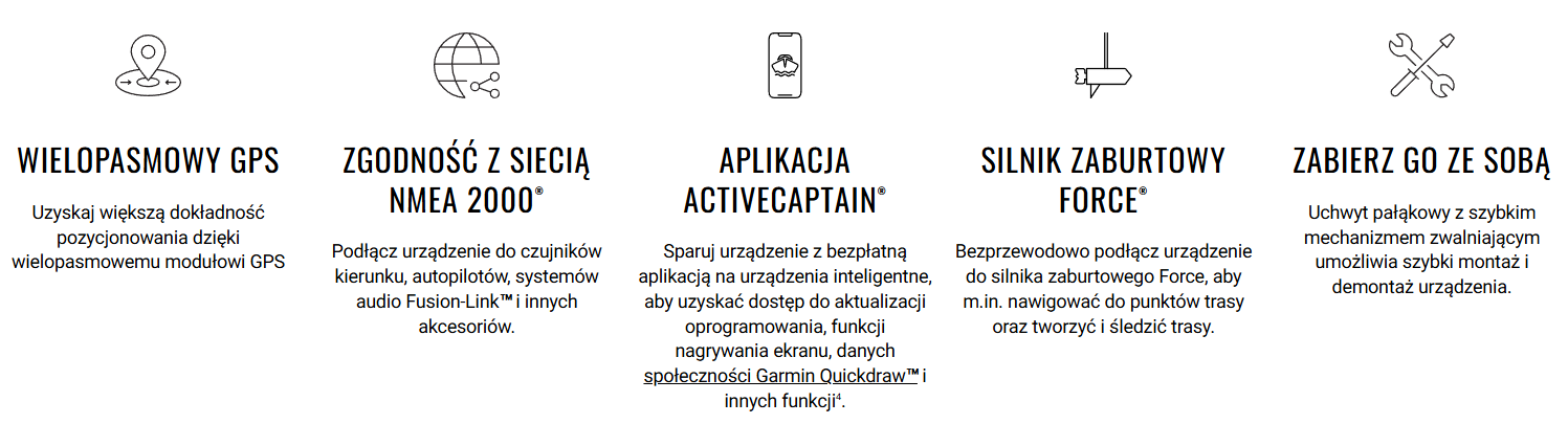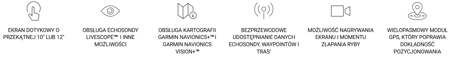 Te wszechstronne plotery nawigacyjne — wyposażone w duże, wyraźne ekrany dotykowe czytelne w pełnym słońcu — zapewniają nowe możliwości namierzania ryb na wyciągnięcie ręki. Plotery te obsługują mapy Garmin Navionics+™ i Garmin Navionics Vision+™, a zestaw z przetwornikiem dodaje do konfiguracji echosondy skanujące Ultra High-Definition oraz tradycyjną echosondę CHIRP.